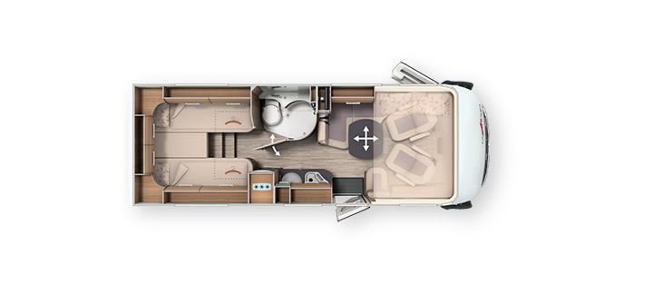 Die Möbelarchitektur „smartline“ passt sich perfekt an die schmale Fahrzeugbreite an und überzeugt mit höchstem Wohnkomfort und mehr Bewegungsfreiheit. Mit einer L-Wohnsitzgruppe, einer praktischen Seitenküche, einem platzsparenden Bad und extragroßen Betten ist der Grundriss optimal und praxisgerecht ausgestattet. Der Doppelboden-Keller sorgt für zusätzlichen Stauraum, welcher bequem von innen als auch außen zugänglich ist.