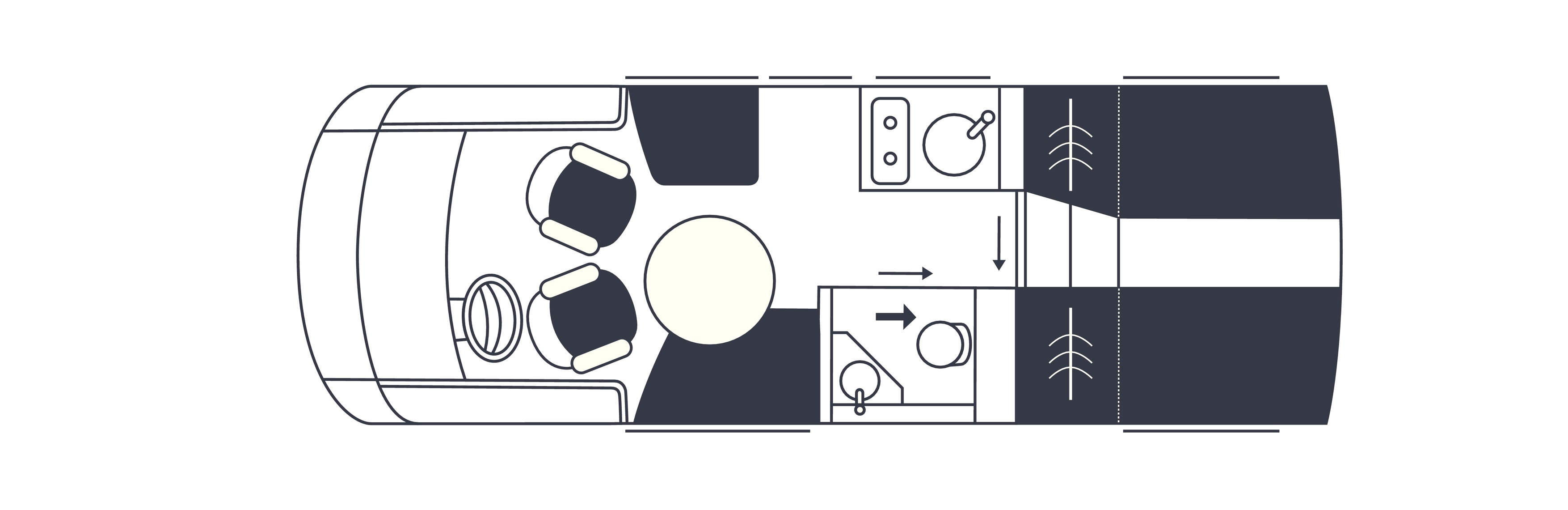 - Sofa Fahrerseite zur L-Sitzbank umbaubar (4 Gurtsitze gesamt), inkl. klappbarer Tischplatte und schiebbarem Tisch dank Bodenschienensystem